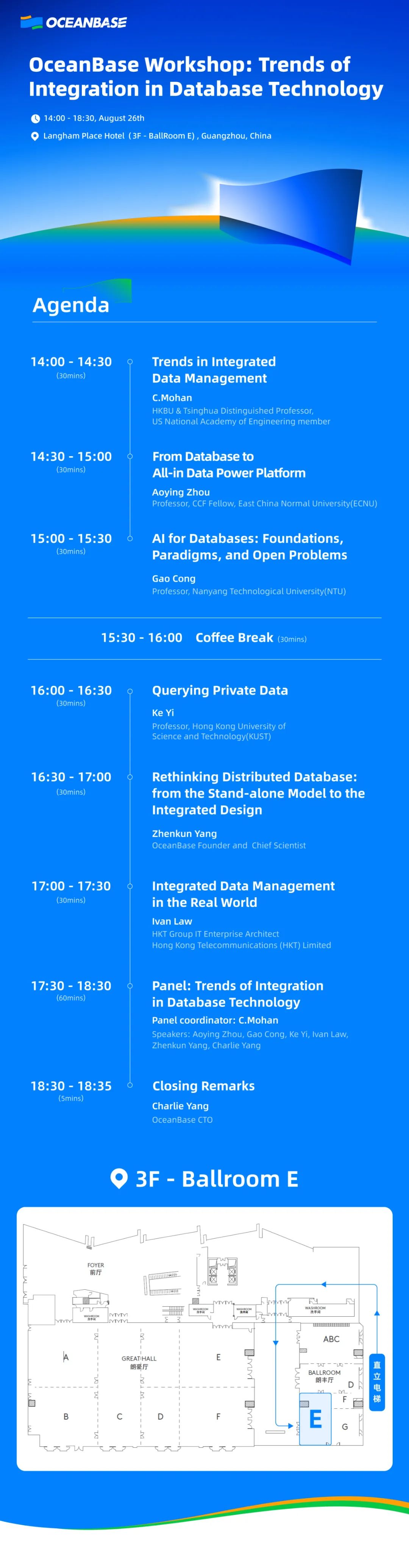 OceanBase CTO 杨传辉将携手 C.Mohan、阳振坤、周傲英、丛高、易珂等海内外知名数据库领域顶尖学者,以及代表工业界最前沿用户实践的香港电信代表嘉宾 Ivan Law,带来数据库一体化技术专场 workshop,倾听学界和工业界的不同声音,在思想碰撞中共同探索数据库技术的未来。