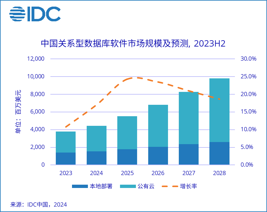 国际数据公司(IDC)于近日发布了《2023年下半年中国数据仓库软件市场跟踪报告》。IDC数据显示,2023年中国数据仓库软件市场规模为9.4亿美元,同比增长7.8%。其中,本地部署数据仓库软件规模4.8亿美元,同比增长3.6%;公有云数据仓库软件规模4.6亿美元,同比增长12.6%。