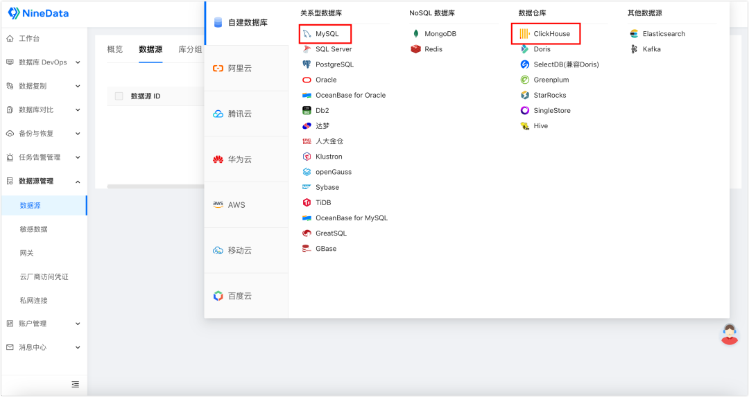 1. 登录 NineData 控制台,单击数据源管理>数据源,然后在页面中单击创建数据源,选择需要录入的数据源。
