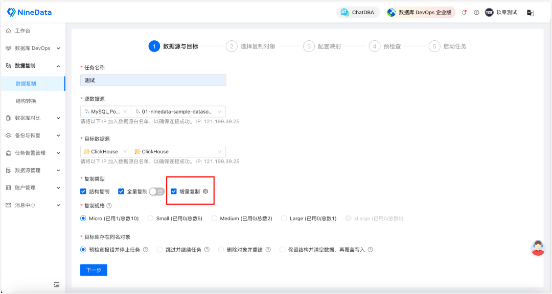 2. 根据页面提示配置复制任务,由于我们想要实现实时数据同步,需要在复制类型处额外勾选增量复制。
