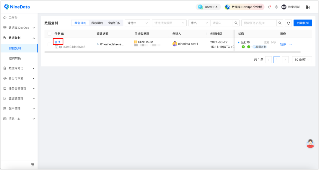 1. 登录 NineData 控制台,单击数据复制>数据复制,然后单击步骤二中创建的复制任务。