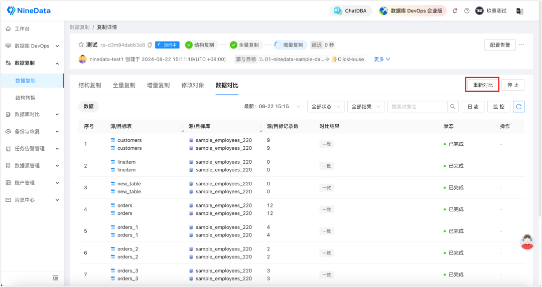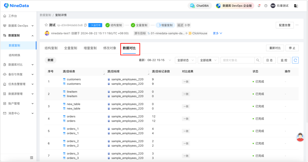 除了同步功能以外,NineData 还提供了同步后源端和目标端同步数据的对比功能,以确保目标端数据的完整性。