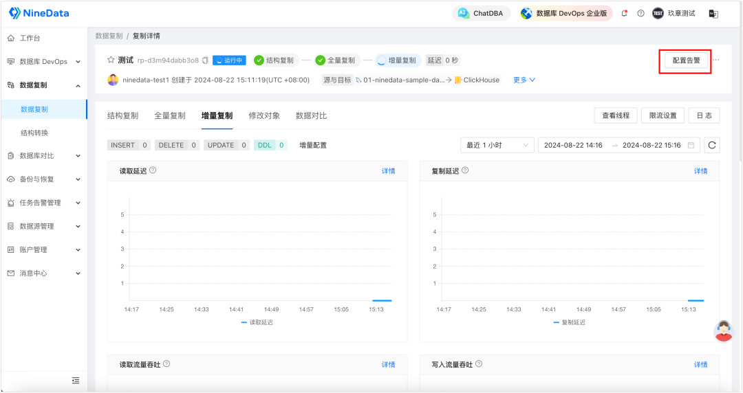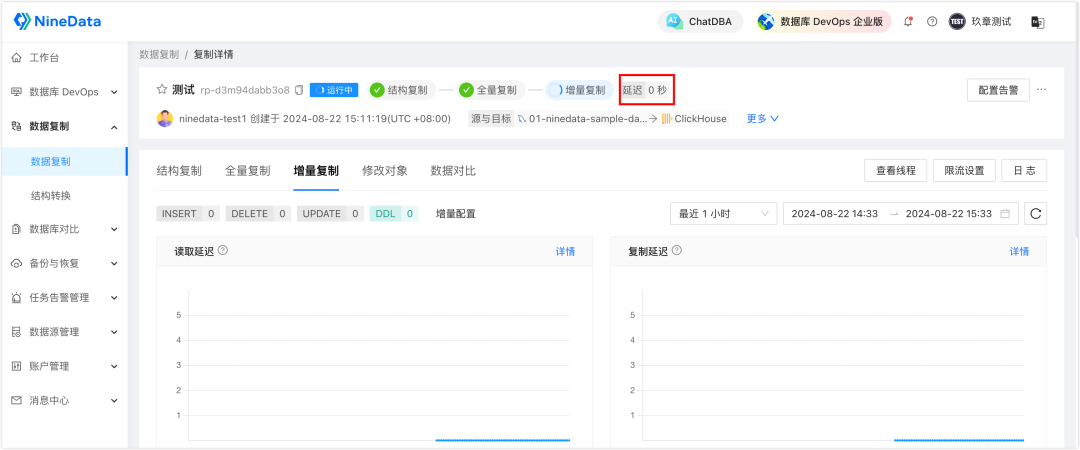 3. 配置完成后启动任务,针对您配置的所有同步对象,NineData 会先对所有的存量数据进行全量迁移,接下来就是实时迁移 MySQL 中新增的增量数据,所有新写入的数据都将一条不漏地同步到 ClickHouse,每当目标端的增量数据追平源端,任务面板中的延迟在零点几秒或几秒之间徘徊时,代表当前 ClickHouse 中的数据已是最新的。