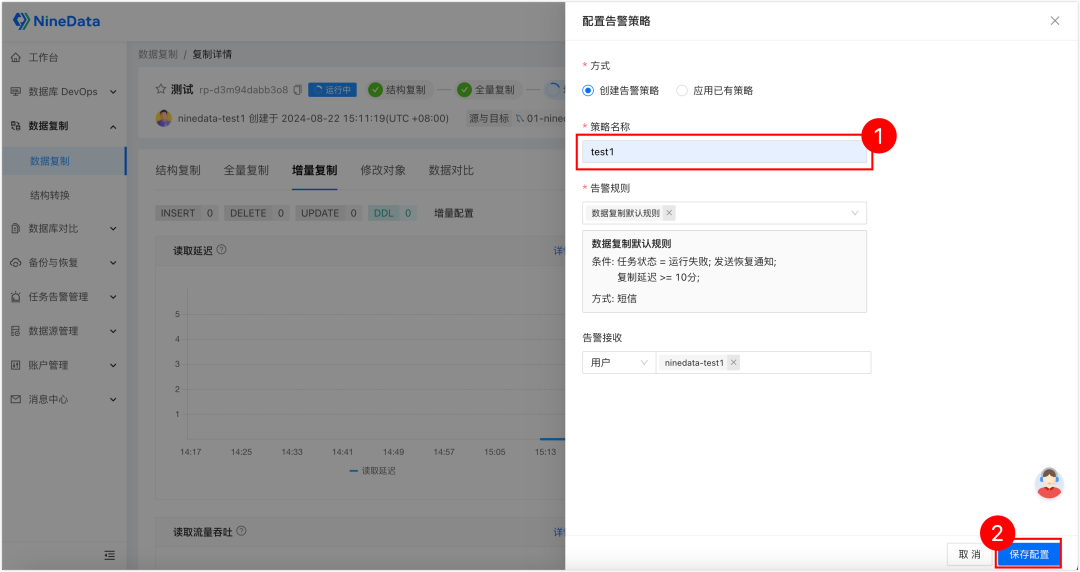 3. 输入策略名称,单击保存配置即可。您可以直接使用内置的默认规则,在任务运行失败,或复制延迟大于等于 10 分钟的时候,发送短信提醒您。您也可以自定义创建规则,根据您的需求来进行通知。