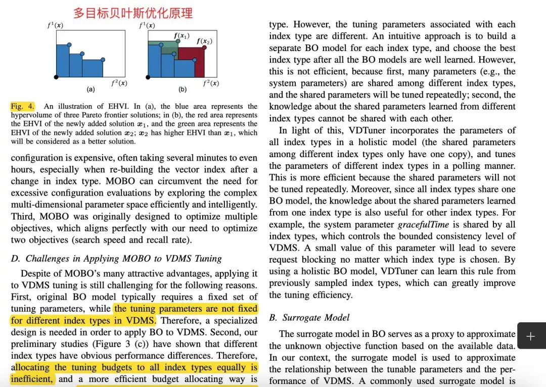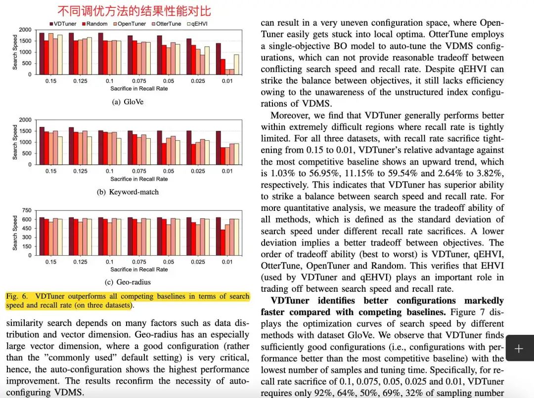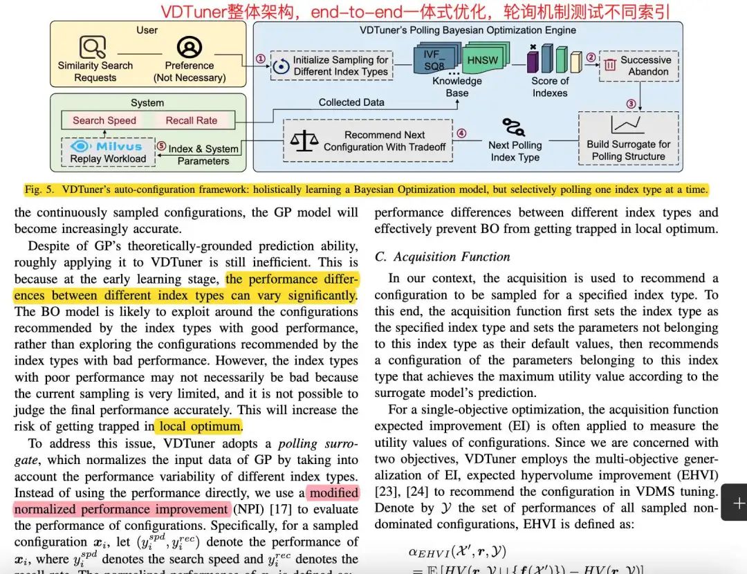 论文基于贝叶斯优化的方法设计了一个向量数据库的自动化调优方法,用双目标、索引类型轮询等方法将向量数据库的场景嵌入到贝叶斯优化的框架下,并得到了较好的收敛性,比通用的索引调优框架效果更好。向量数据库的调优仍然是一个前沿领域,许多问题仍待考虑。比如采样效率仍然很低,模型容易过拟合,如何提高采样效率?再比如模型采用双目标还是单目标,能获得更好的收敛性?构建参数和查询参数是否应该分开调优,分别控制索引整体性能(帕累托曲线),与实际使用时的点性能(固定精度)?延伸阅读