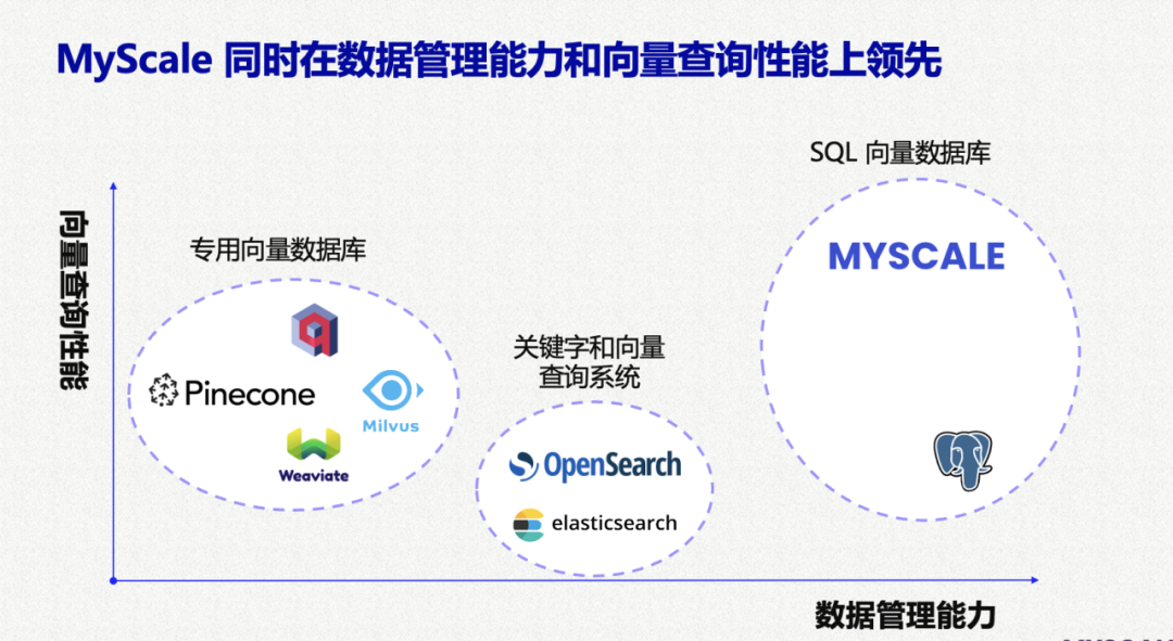 前面的分类图中展示了两个主要的 SQL 向量数据库:pgvector 和 MyScaleDB。pgvector 是 PostgreSQL 的向量搜索插件。它易上手,适用于管理小型数据集。然而,由于 Postgres 的行存劣势和向量算法的限制,pgvector 在大规模、复杂向量查询的准确性和性能方面往往较低。