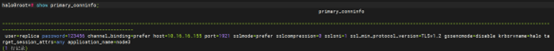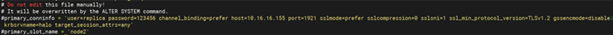 vi /data/halo/postgresql.conf10.16.16.156: primary_conninfo = 'user=replica password=123456 channel_binding=prefer host=10.16.16.155 port=1921 sslmode=prefer sslcompression=0 sslsni=1 ssl_min_protocol_version=TLSv1.2 gssencmode=disable krbsrvname=halo target_session_attrs=any application_name=node2' --重载 pg_ctl reload 查询: show primary_conninfo; 10.16.16.157: primary_conninfo = 'user=replica password=123456 channel_binding=prefer host=10.16.16.155 port=1921 sslmode=prefer sslcompression=0 sslsni=1 ssl_min_protocol_version=TLSv1.2 gssencmode=disable krbsrvname=halo target_session_attrs=any application_name=node3' --重载 pg_ctl reload 查询: show primary_conninfo; 10.16.16.162: primary_conninfo = 'user=replica password=123456 channel_binding=prefer host=10.16.16.155 port=1921 sslmode=prefer sslcompression=0 sslsni=1 ssl_min_protocol_version=TLSv1.2 gssencmode=disable krbsrvname=halo target_session_attrs=any application_name=node4' --重载 pg_ctl reload 查询: show primary_conninfo;