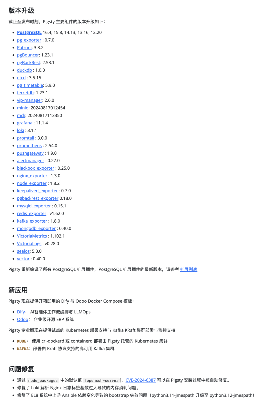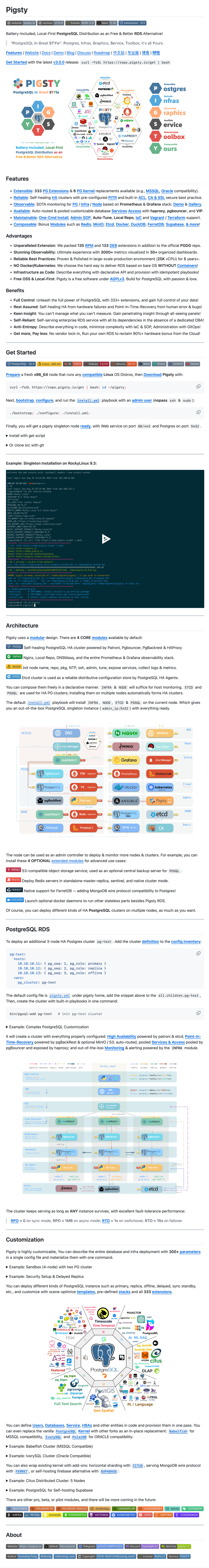 2024-08-28,Pigsty v3.0 正式发布。时隔一年半后,又一个大版本更新,带来了一系列史诗级特性:史无前例的海量扩展插件,提供 Oracle 与 SQL Server 兼容性的替换内核,以及完整在本地运行的 SOTA RDS 服务。