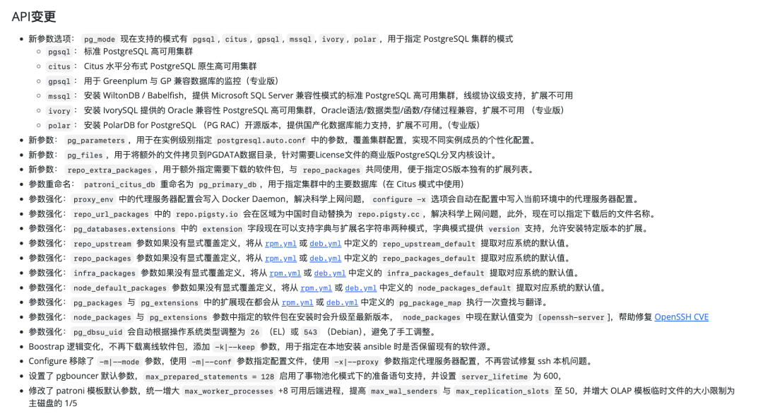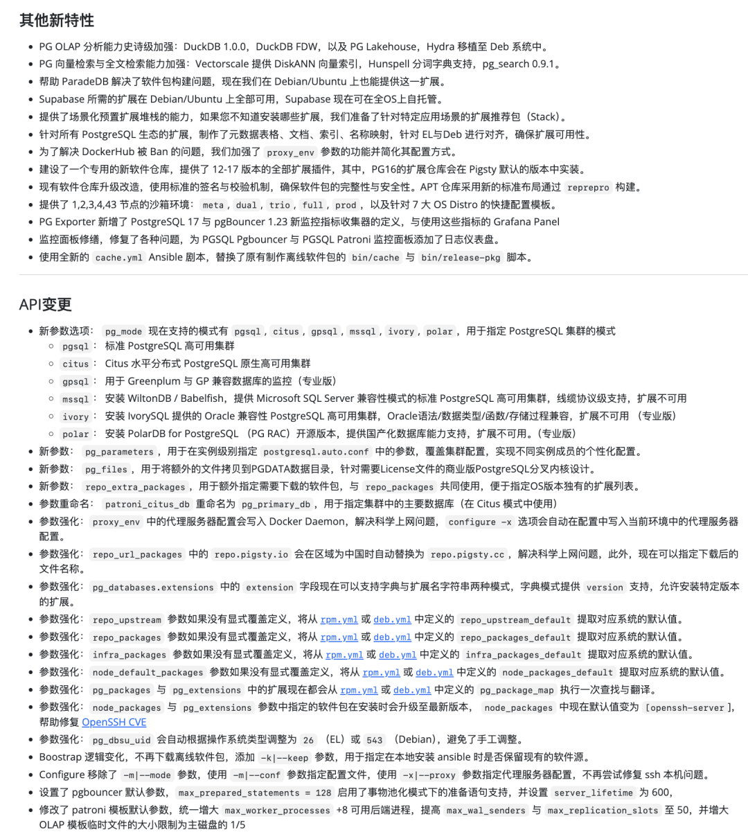 API 参数变更与配置模板变更:EL 系与 Debian 系配置模板现在收拢统一,有差异的参数统一放置于 roles/node_id/vars/[8] 目录进行管理。配置目录变更,所有配置文件模板统一放置在 conf 目录下,并分为 default, dbms, demo, build 四大类目。