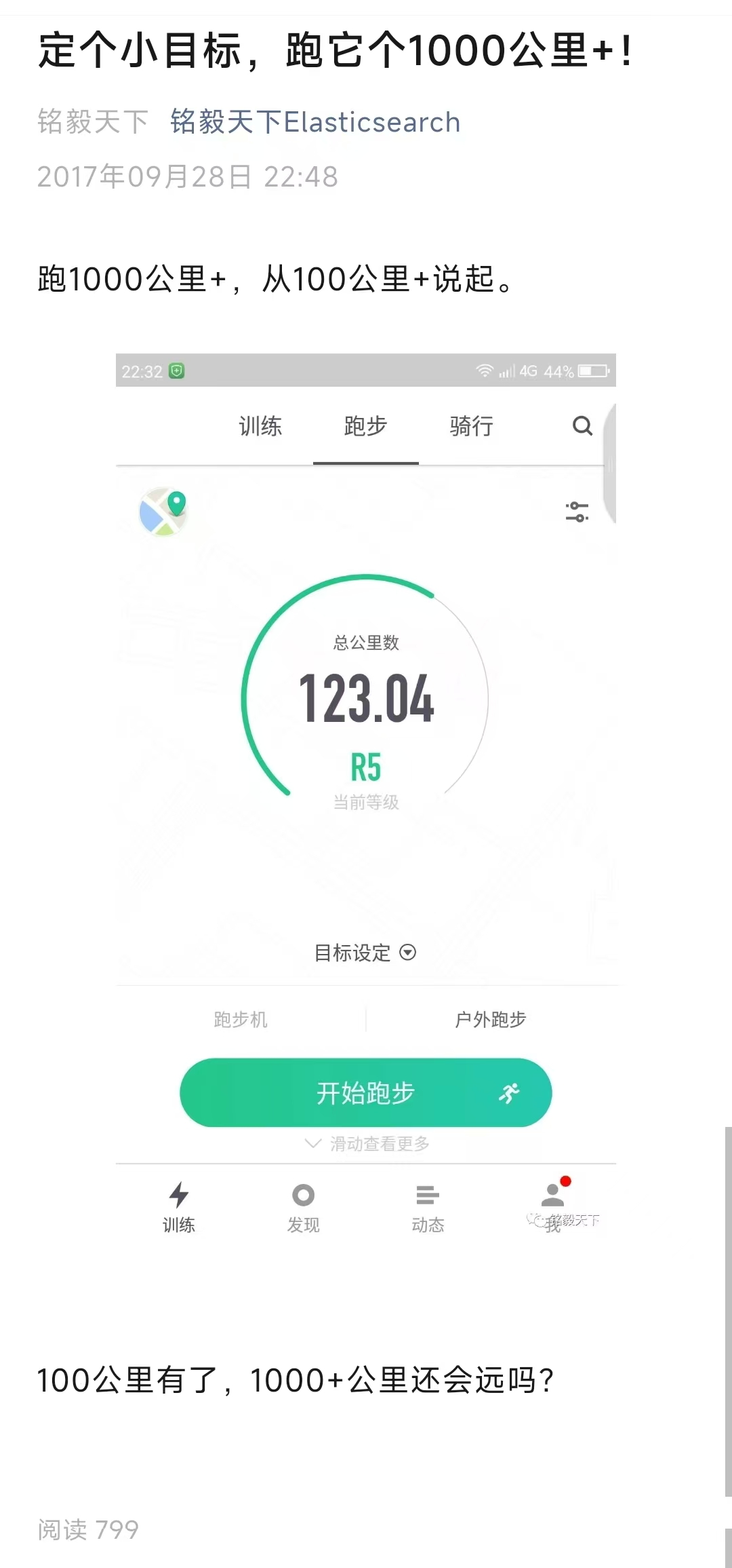 在跑步累计 100 公里的时候,当时定了个小目标:1000 公里。