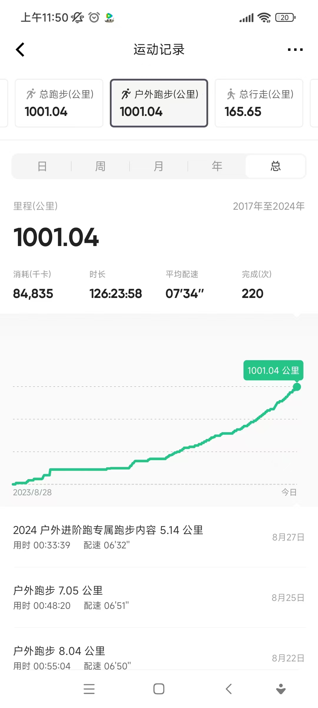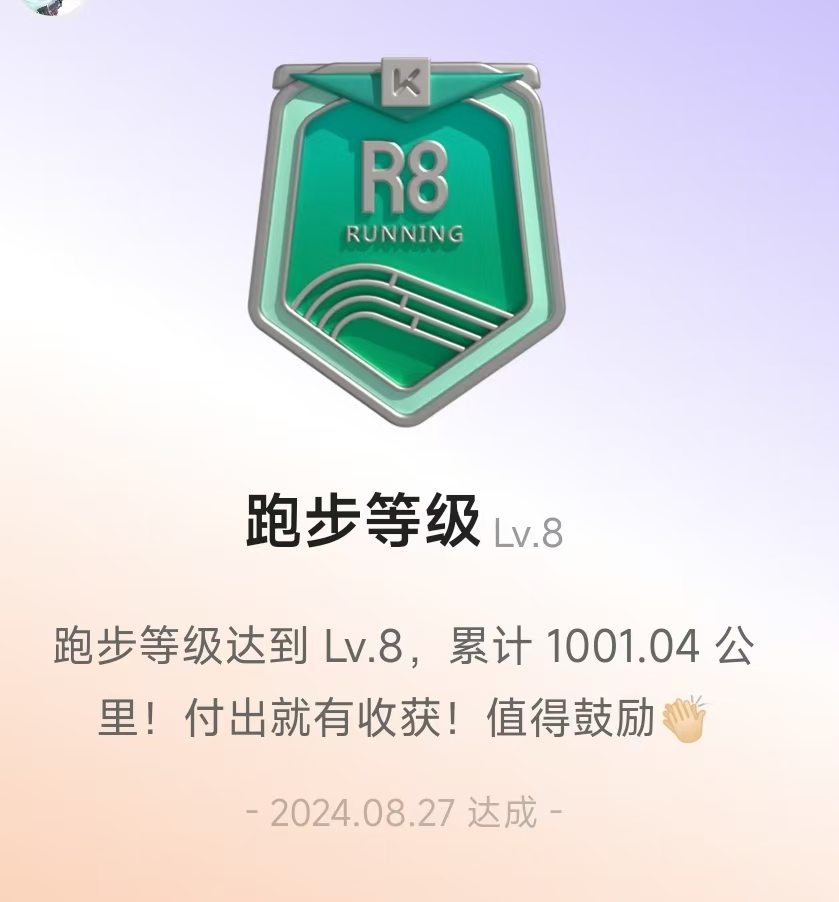 没想到,这一晃过去了 7 年,就在今天 2024年8月27日,累计跑量突破 1000 公里。