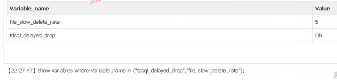 7、厂家反馈TDSQL使用file_slow_delete_rate参数来控制删除速度。TDSQL默认情况下的删除速度是每秒5M。这里为了尽快释放存储所以将每秒删除速度调50M。通过show variables where variable_name in("tdsql_delayed_drop","file_slow_delete_rate");
