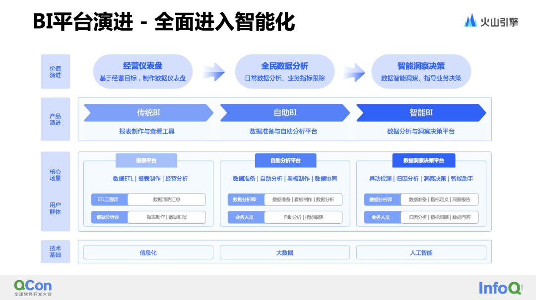 BI 概念最早由 Gartner 机构于1996年提出,指的是通过应用基于事实的支持系统,来辅助商业决策的制定。简言之,第一代 BI 主要是以 IT 为中心的预定义报表平台。然而,当时计算机技术、存储技术等都还在发展中,这限制了 BI 技术的发展。经过了20多年的发展,传统BI的功能越来越强大,但这一时期的 BI 产出仍然是相对固定的汇总报表。IT 部门和业务部门之间反复来回的沟通和需求,导致了响应周期漫长、价值难以直观呈现等问题。到了 21 世纪初,以具有一定IT能力的业务人员为中心的自助式数据分析平台开始流行。在此时期,“敏捷BI”开始成为热潮,国内的主要BI厂商也纷纷涌现,竞相开发可自助式分析的 BI 产品。敏捷 BI 在一定程度上解决了部门协同的问题,逐渐融入到业务日常的办公生活中。但它也具有一定局限性,例如,存在长尾数据处理方面的困难,分析经验和知识体系难以沉淀,IT 部门难以为其提供后续技术支持。2010 年后,尤其是近五年来,BI 开始与 AI 融合,更注重以纯业务人员为中心,借助自然语言处理技术,打造搜索驱动的数据分析平台,实现数据消费的零门槛。不仅如此,它还能完美支持长尾数据,实现知识沉淀和经验共享。起初,这种尝试主要集中在数据消费层面,数据采集、加工、处理等环节的智能化应用较少。然而,近年来随着数据的充分消费,更多环节的智能化应用需求日益凸显,BI 正不断拓展智能化阶段的应用范围。/ 抖音集团企业级BI建设历程