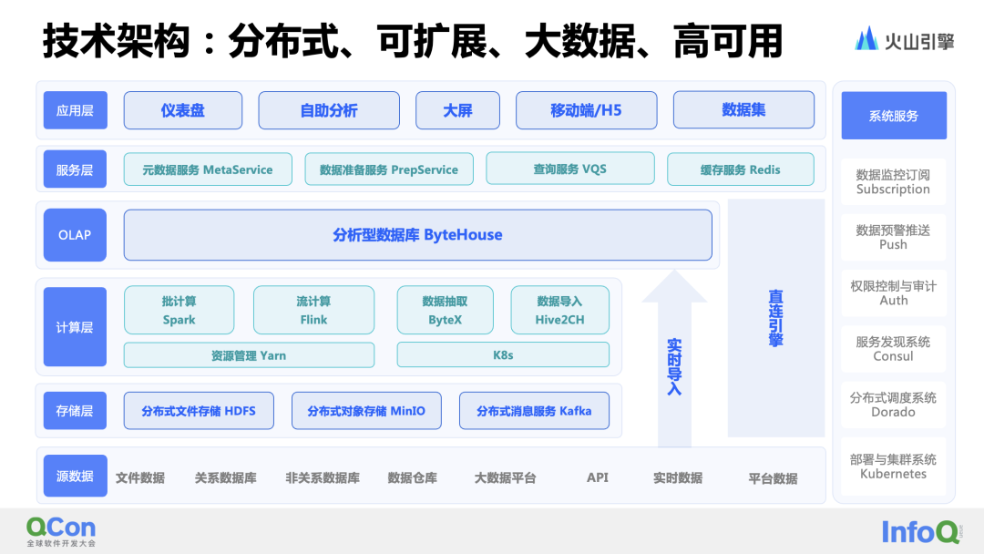 完善的大数据架构及高性能查询引擎是高效数据分析的基石。智能数据洞察的技术架构,可以从六个层级(自下至上分别为:源数据层、存储层、计算层、OLAP 层、服务层、应用层)与系统服务合计七个部分来了解。