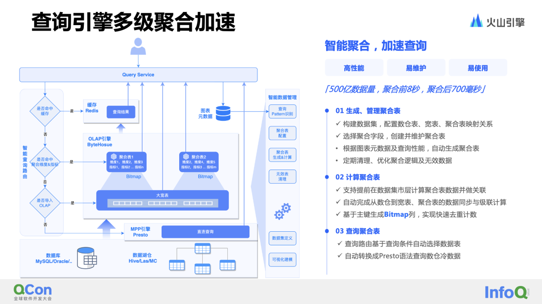 除了引擎本身的性能,也需要应用层的精细化调优和治理。智能数据洞察采用了多项技术,如多级数据聚合、冷热数据分层等,以进一步提高数据的查询性能,优化存储成本,从而最大程度地满足大型集团或高速发展企业的海量数据应用需求。在实际应用中,企业可以针对数据进行多级聚合分析,并结合缓存机制和实时访问,以实现大规模数据和高性能分析之间的平衡。通常企业会构建自己的数仓,但数仓中并非所有数据都可直接用于业务查询。常见的做法是根据实际情况建立业务数据宽表,这些宽表通常以明细数据表的形式构建,其中包含大量明细数据,但直接查询大量明细数据可能会导致性能压力。针对这种情况,智能数据洞察支持在同一数据集上配置宽表和聚合表,以提供不同粒度和维度的数据表,提高查询分析性能。智能数据洞察采用智能路由方案,在用户查询时,会根据查询的维度和指标,动态地适配或寻找最低消耗的聚合表来查询数据。若找不到合适的聚合表,查询将下沉到业务宽表。若宽表数据仍无法覆盖查询的分区范围,任务将转换为基于 Presto 引擎直接查询数仓中的数据。综上所述,从用户视角来看,在查询一份数据的过程中,实际上产生了多个粒度的聚合查询。系统根据实际情况匹配并命中相应的聚合表进行查询,从而实现最优性能。此处,智能数据洞察结合了 ByteHouse 的 Bitmap 能力,在聚合时会对需要去重计数的列(如 id 等)创建 Bitmap 索引,以便分析过程中,在聚合表中进行去重计数。如果客户的数仓建设尚未成熟完善,同时对 ByteHouse 存储大量数据的成本有所顾虑,那么智能数据洞察可以利用 ByteHouse 的冷热数据分层功能,在实现查询高性能的同时,有效节约资源成本。