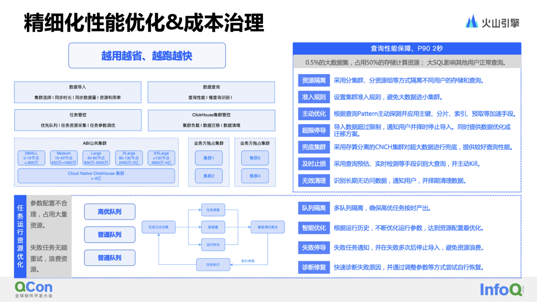 在查询性能方面,提供了多种治理手段以确保查询性能 p95 在2秒以内。例如:为不同的集群设定数据量的准入规则,以避免大数据量的表直接导入对集群稳定性造成影响;主动根据数据的查询模式,推荐对表设置主键、分片、索引等性能优化方案;对长时间无访问的数据进行识别并清理优化。