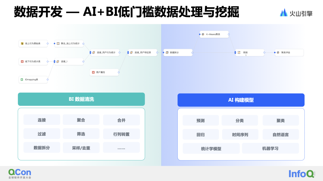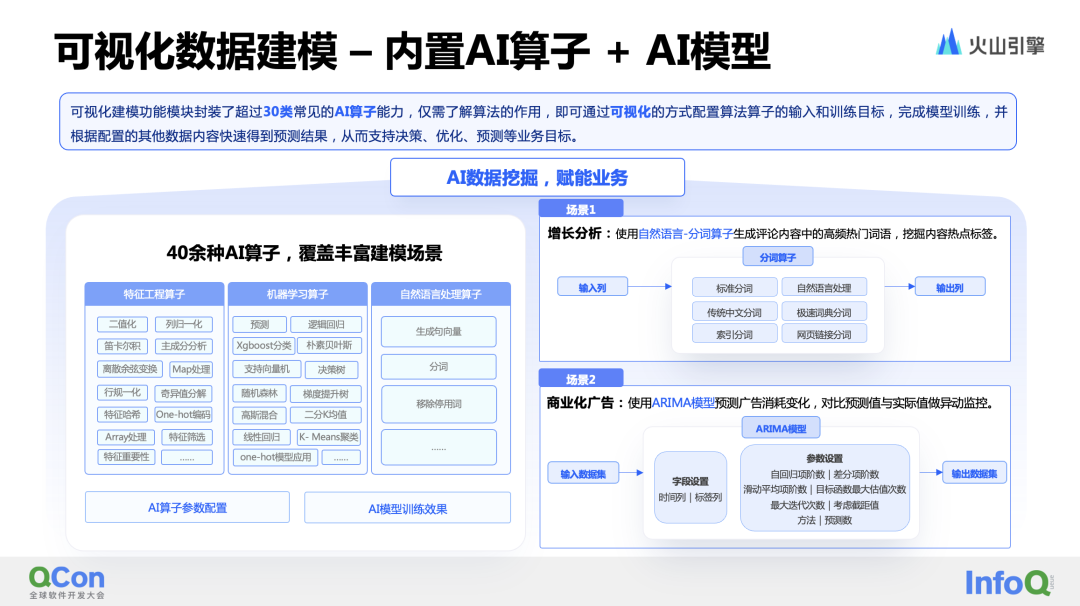 在数据准备阶段,将普通的数据 ETL 流程和 AI 挖掘流程进行合并。这使得普通的数据分析师除了能够快速进行数据的预处理外,还可以进行一些常见的数据挖掘操作,例如分类、回归和预测等。通过封装 30 类(40+)常见的算子,用户只需通过拖拽算子节点并配置相应的输入,就可以在数据流中直接应用这些算子。除了常见的 AI 算子外,还提供了一些常用的 AI 模型,如用于广告消耗预测的ARIMA模型。用户只需了解算法的应用场景,结合自身数据完成算子的基础配置和训练目标,即可完成模型的预训练。之后,该模型便可结合其他数据内容得到预测结果,为业务判断和决策提供支持。