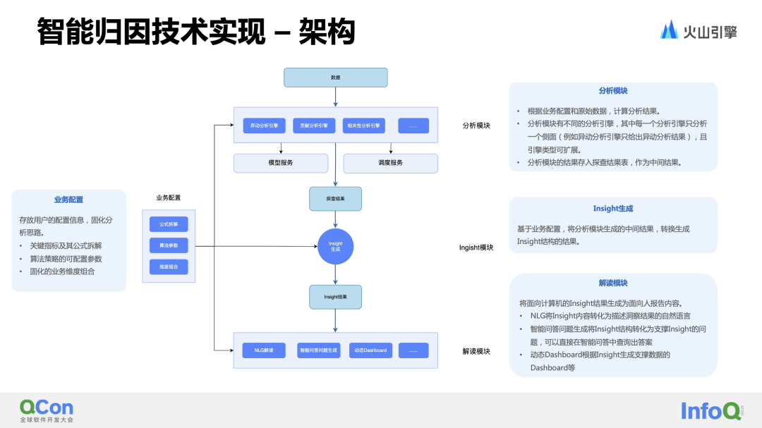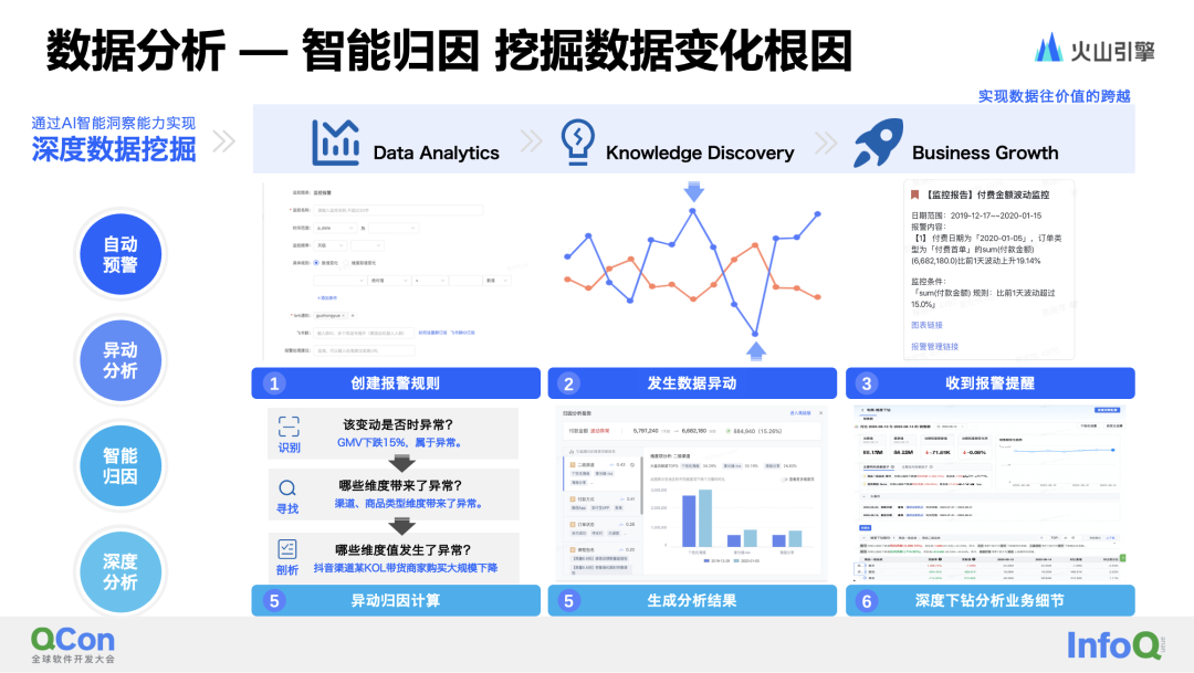 除了数据处理过程中的数据挖掘外,针对数据结果进行异动检测和归因分析也是当前主流的智能化应用场景。抖音集团的商业智能(BI)团队在智能归因领域进行了大量的探索和尝试,最终成功地将异动检测、归因分析、洞察报告、指标分析树等产品化能力落地于实际业务中。(1) 用户对需要监控并进行异动分析的指标进行配置,包括异动检测算法和规则的设置,以及归因分析方法和路径的选择。