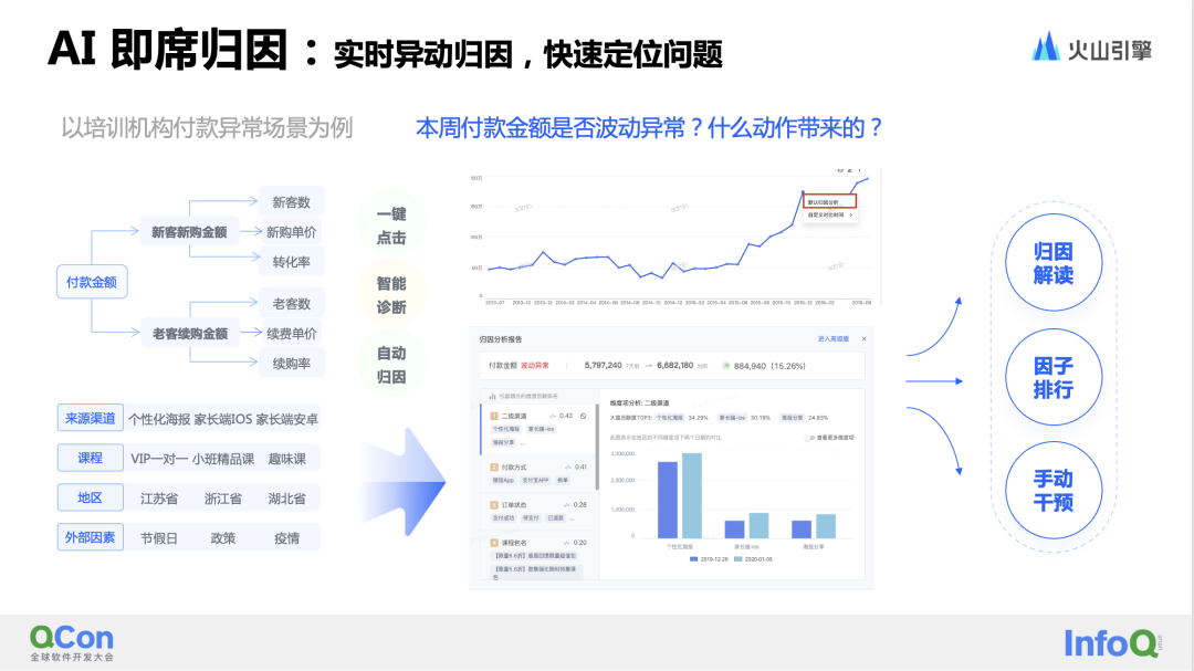 在归因分析中,即席归因是一种简单常用的实时归因手段,用户在发现指标异常时可以立即使用。以业务付款金额大幅增长场景为例,分析师或业务人员可以通过在图表的数据点上直接点击“默认归因分析”,快速获得自动归因结果。