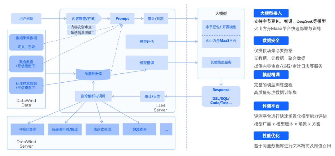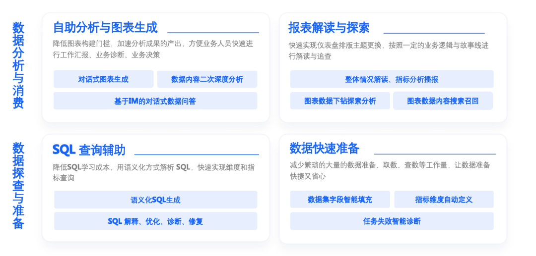 2022 年底,随着ChatGPT的兴起,各领域都在尝试应用大模型的能力,以创造和优化场景。其中,数据分析领域是最早尝试、进展最快的方向之一。大模型的推理、检索和生成能力,使数据的使用门槛在交互方式和分析技能方面都大幅降低。在大模型的加持下,BI+AI 的场景变得更加具体、可实现。智能洞察平台DataWind也在这方面做了大量的探索,不断进行迭代和优化,最终完成了以下几个场景的内部验证。● 数据准备阶段