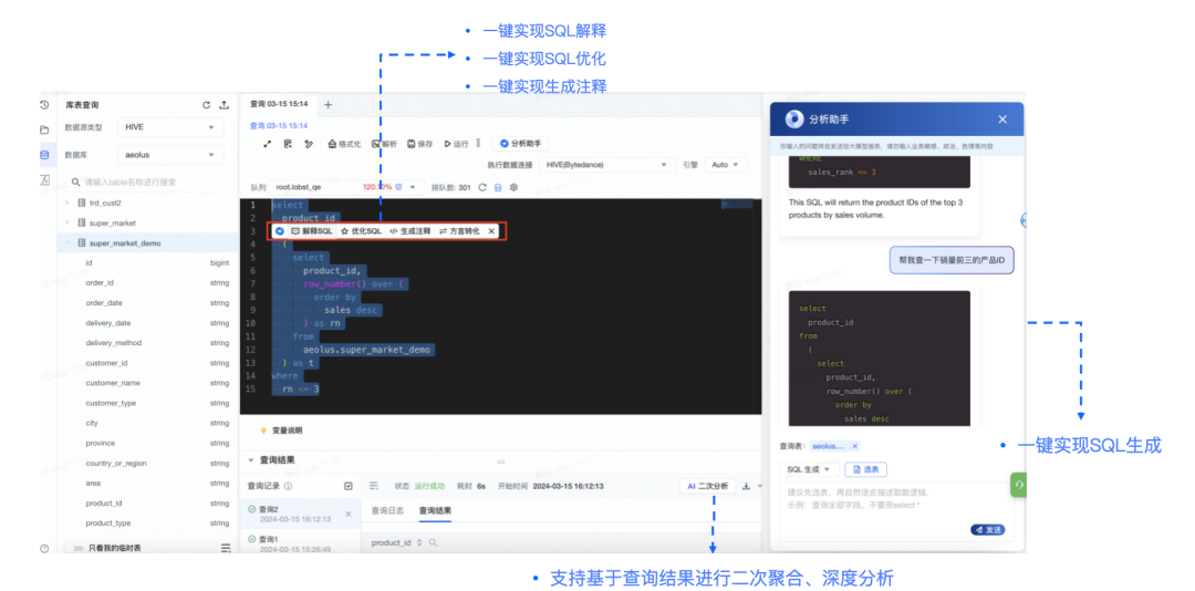 通过大模型的自然语言和数据理解能力,帮助用户自动生成数据集的相关信息,包括数据集描述、字段名称/描述等,且在用户编写自定义SQL时提供SQL代码辅助能力。