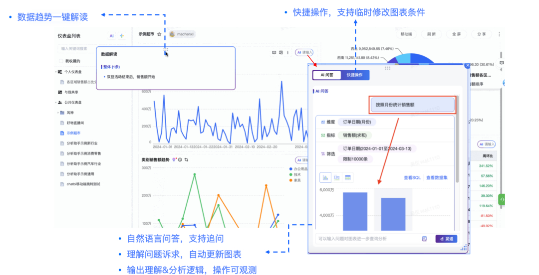 可以进行仪表盘生成、自定义主题配色,进行基于IM的仪表盘探索分析等能力。