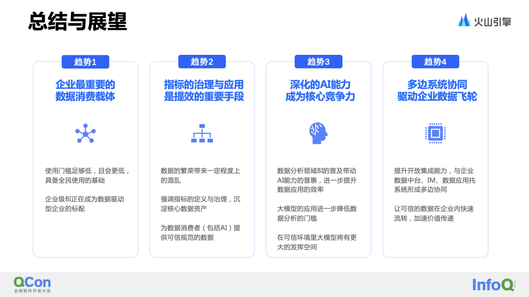 在Gartner最新的魔力象限中,针对BI新增了三个关键能力定义,分别是metrics store, collaboration and data science integration(指标库、协作和数据科学集成)。从这新增的三个能力中,可以看出,数据资产的规范化、数据驱动业务的效率、数据科学的深度应用是当前比较重要的发展方向。Gartner 所预测趋势及关键能力定义变化,与我们的趋势判断相吻合。在近几年的 BI 平台建设中,我们认为有2个比较显著且值得关注的趋势:大模型趋势下,企业数据体系面临着新的挑战和机遇。围绕数据分析的链路来看,大模型在不同环节中都有着较大的探索空间。加速数据加工、数据预处理的过程——数据资产、高效计算、自动编排;进一步降低数据分析与挖掘的门槛,Consumers Become Creators;嵌入式AI助手,深入业务系统、OA、数据产品等领域。
