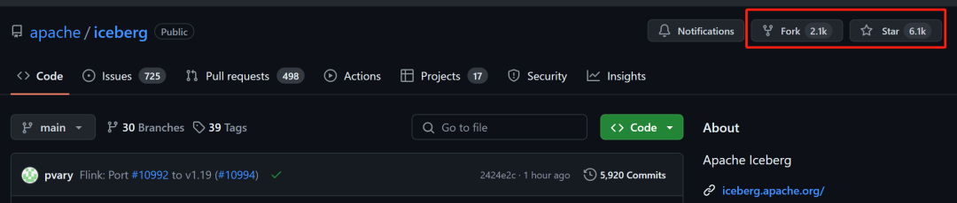 目前apache Iceberg在github上拥有2.1k的fork和6.1k的star: