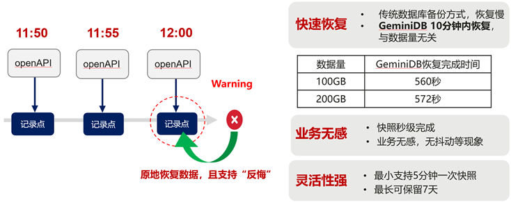 GeminiDB的PITR特性支持绝大多数场景下的任意时间点数据恢复,恢复时间可以精确到秒级,并且业务的运行不会受到任何影响。