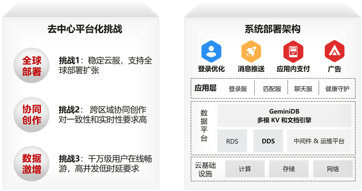 某游戏公司拥有1.3亿全球月活用户,7000万UCG开发者生态,2亿+的用户创作场景,面临全球快速部署扩张,跨区域协同创作,千万级用户在线畅游等挑战。将数据搬迁至GeminiDB后,系统性能整体提升5倍,访问时延稳定在0.1ms,可轻松支撑千万级玩家在线畅游;同时保证数据的强一致性,TB级地图数据实时同步更新;支持存储秒级扩容,轻松应对20多个轻业务高峰变化。