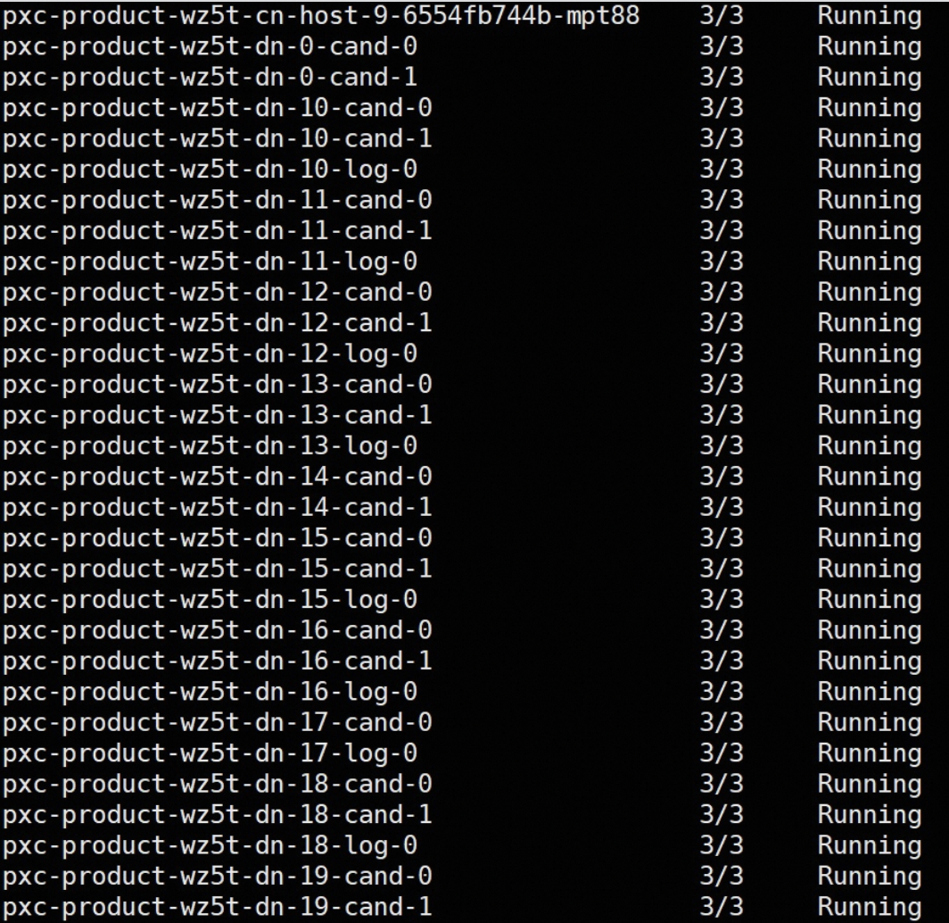 基于开源的 polardbx-operator, 中盾数科在 Kubernetes 集群上快速完成数十节点的PolarDB-X 部署,将数据迁移至PolarDB-X,未增加业务改造成本的情况下,完成业务切换。下图给出了中盾数科部署的 PolarDB-X 数据库的信息: