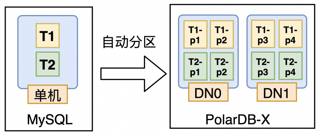迁移到 PolarDB-X 后,基于自动分区的能力,表结构无需改变,即可实现数据的自动打散, 将数据均匀分布到多个DN 节点上。使用上述CRATE TABLE 语句在 PolarDB-X 执行后,实际的表结构如下。可以看到 PolarDB-X 已经默认按照主键 id 分区,打散数据。