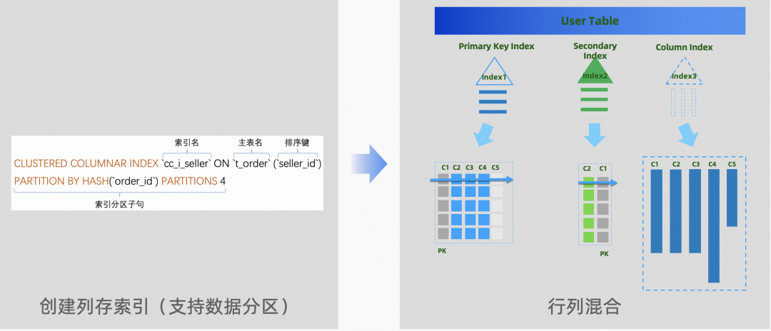 CREATE CLUSTERED COLUMNAR INDEX这样的 DDL 即可为行存表创建列存索引,实现行列数据的混合存储。面向行列混合场景设计SQL优化引擎,通过一套引擎支持行列混合查询,能够在一套数据库内很好地满足业务复杂查询的需求。