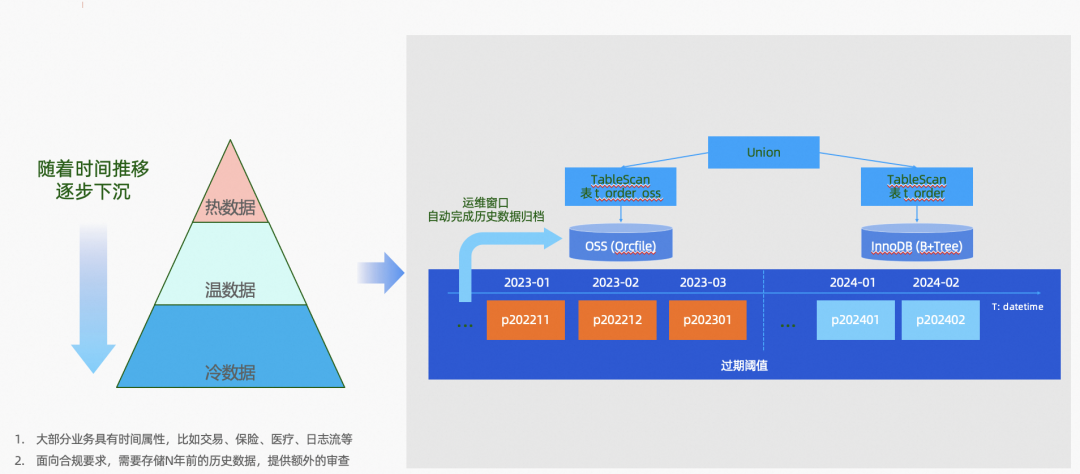 针对大量历史数据的问题,PolarDB-X 提供冷数据归档能力,支持按照时间维度自动将超过一定时限的历史数据转存至低成本的对象存储(OSS, S3, Minio)上,形成一张归档表。