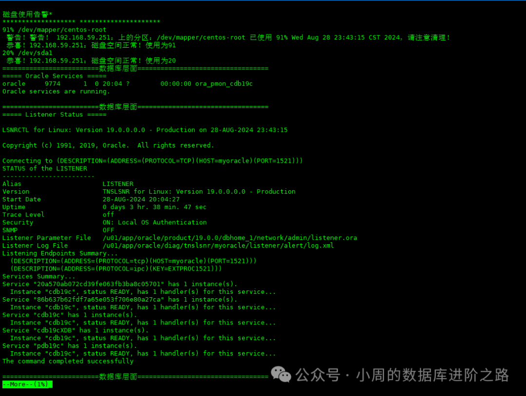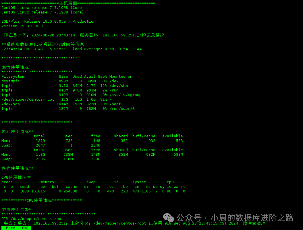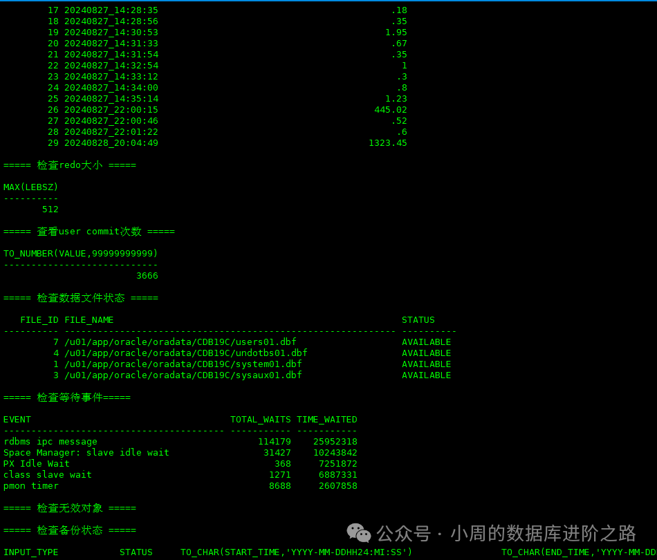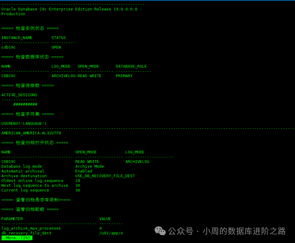 今日分享oracle 19c一键巡检脚本,脚本需要oracle用户权限,赋予执行权限,一键执行即可。大家可以根据自己的实际情况进行内容的增加和减少。
