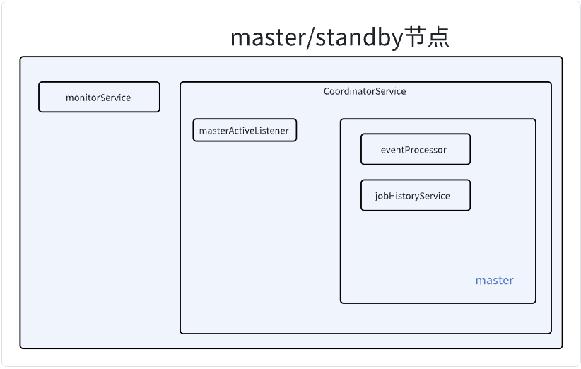 executorService (所有可能被选举为master的节点) jobHistoryService (master节点) eventProcessor (master节点)