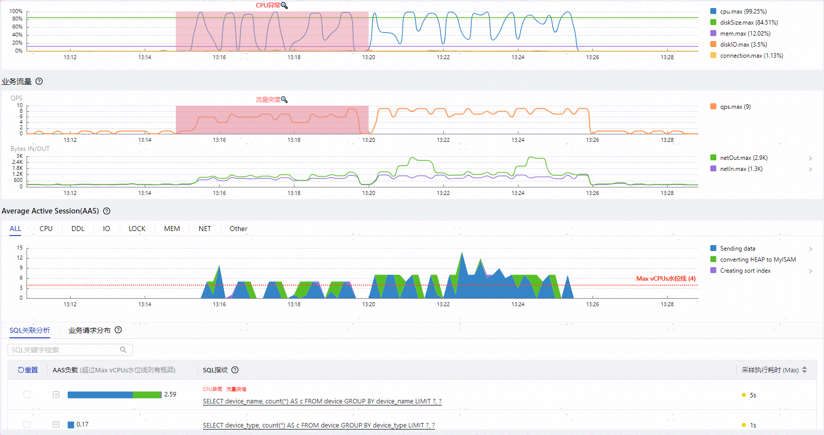 cpu使用率从99%降低到了10%以下,SQL执行时间变成了1秒以内,不再有converting HEAP to MySIAM/desk 事件。
