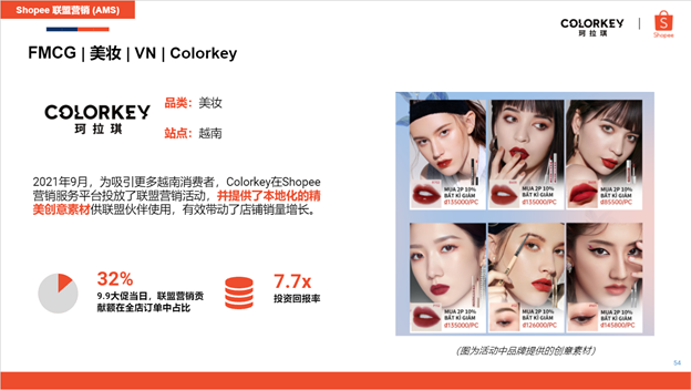 Shopee联盟营销以其高效的引流机制和灵活的佣金制度,成为了众多跨境电商的引流神器。以知名美妆国货品牌Colorkey为例,该品牌通过Shopee联盟营销,在越南市场实现了显著的销量增长。去年9月,特别是在9.9大促期间,Shopee联盟营销为Colorkey贡献了高达32%的全店订单占比,投产比更是达到了惊人的7.7。这一成绩不仅彰显了Shopee联盟营销的强大引流能力,也证明了通过精准营销和渠道合作,能够有效提升品牌知名度和销售额。