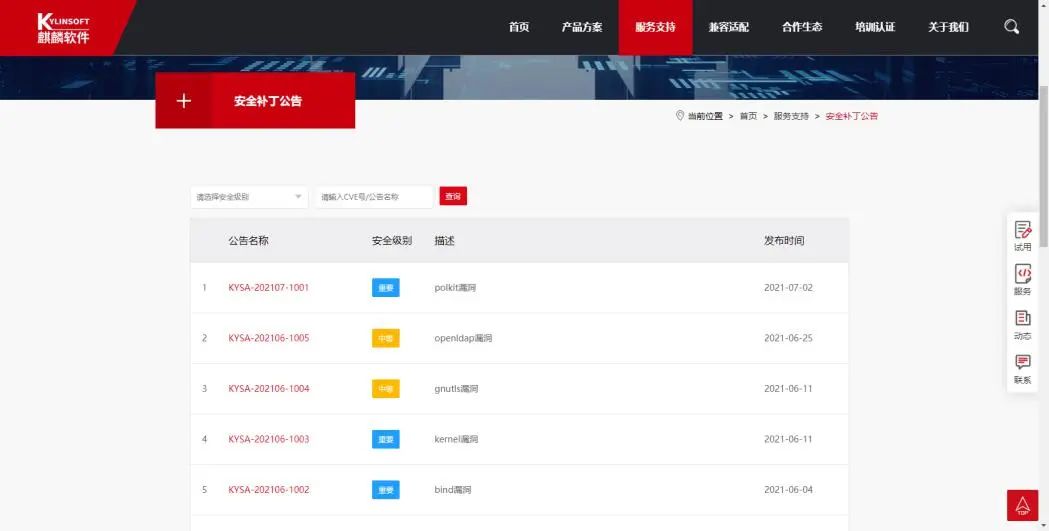 麒麟软件安全补丁发布公告