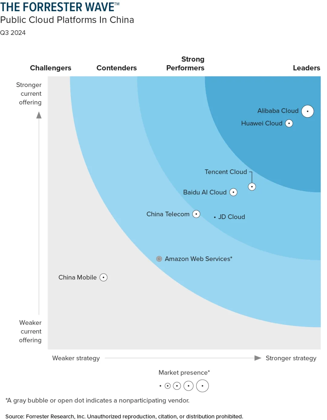 ❖ Forrester:2024中国公有云评测报告2024年8月,Forrester发布了中国2024年公有云厂商的评估报告(The Forrester Wave™: Public Cloud Platforms In China, Q3 2024),厂商入围标准是年收入大于70亿RMB,并且在中国有广泛的影响力,能入围Forrester Wave的厂商已经代表了其具备强大的实力。