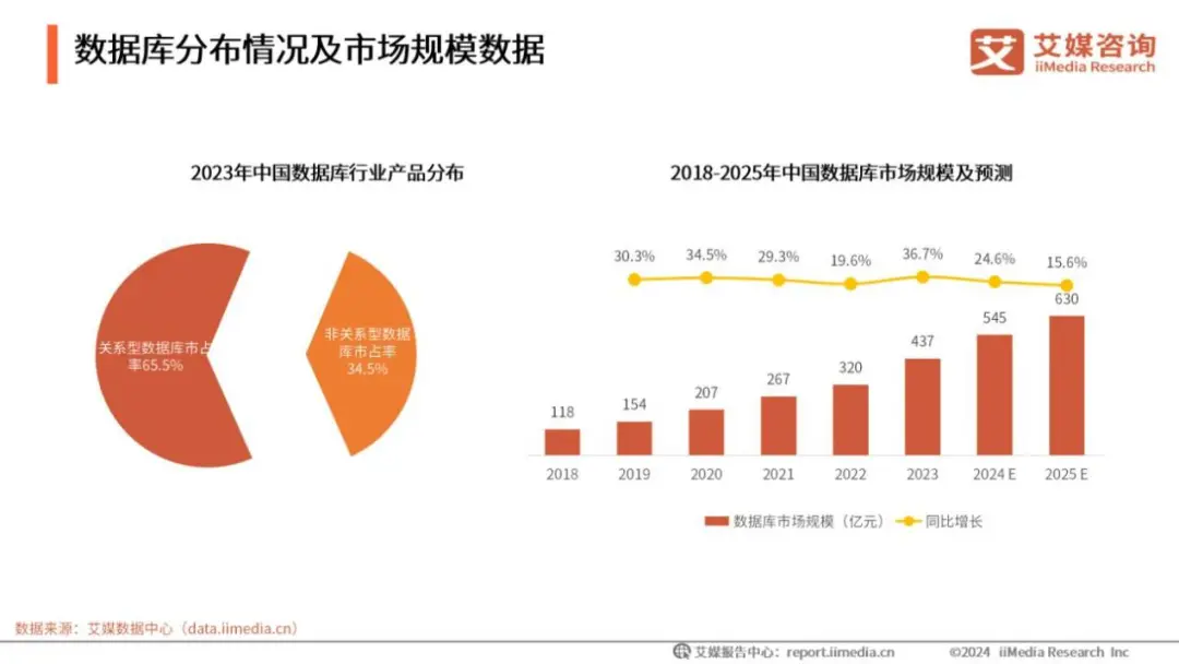 2023年中国数据库行业市场规模为437亿元。随着国内数字化转型节奏加快以及国产替代浪潮涌动,基础软件领域迎来了高速发展,数据库作为信息系统核心软件以及信创的关键环节,迎来产业黄金期。中国数据库行业市场规模将持续上升,预计2025年有望达630亿元。