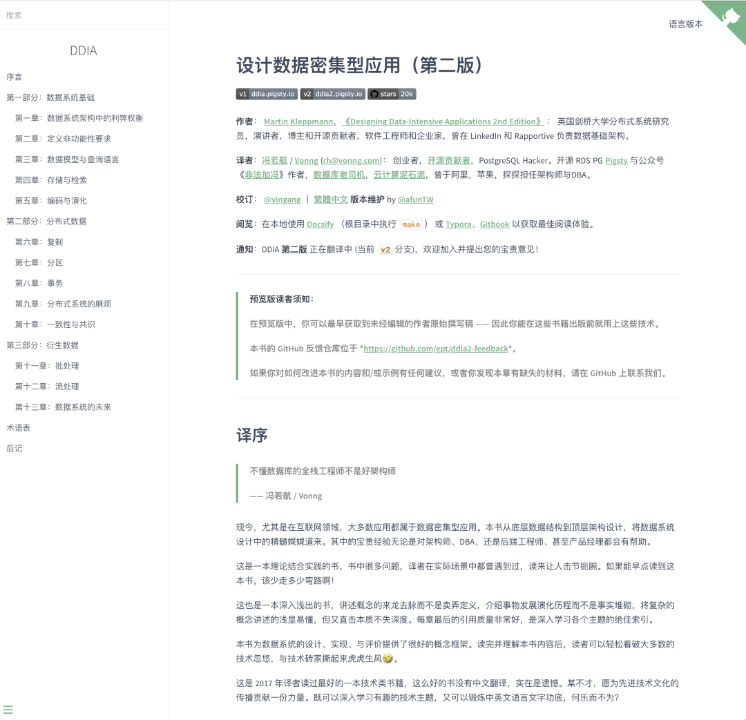 DDIA 第一版出来时,我在 GitHub 上拉起了一个开源项目,提供了一个学习版本的中文翻译,有许多朋友都参与了进来,已经有90位贡献者与近2万Star,打磨出了一个相当完善的中文翻译版本。这种群策群力共享共建的模式,展现出了开源社区的强大力量。