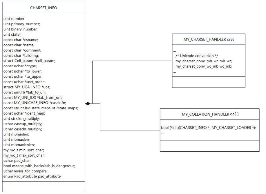 实现一个字符集和比较规则,都会定义对应CHARSET_INFO类型的全局变量,针对‘cset’和‘coll’两个字段,还需要提供这个函数的实现,这样当用到指定的字符集和字符序时就会调用到具体的实现的函数了。