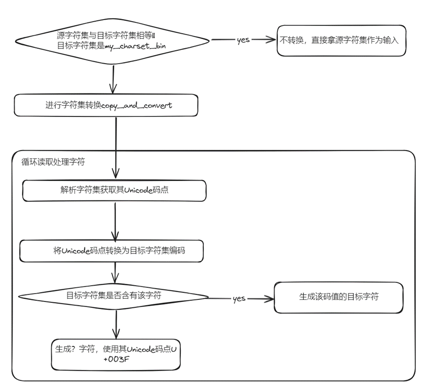 首先,判断是否需要转换。如果两个字符集相同或者目标字符集是my_charset_bin,则不需要转换,直接用源字符串即可,否则就会触发字符集转换;还有一种场景是,当原字符集为binary字符集时,需要格外注意,系统会直接逐字节复制,不进行任何检查。