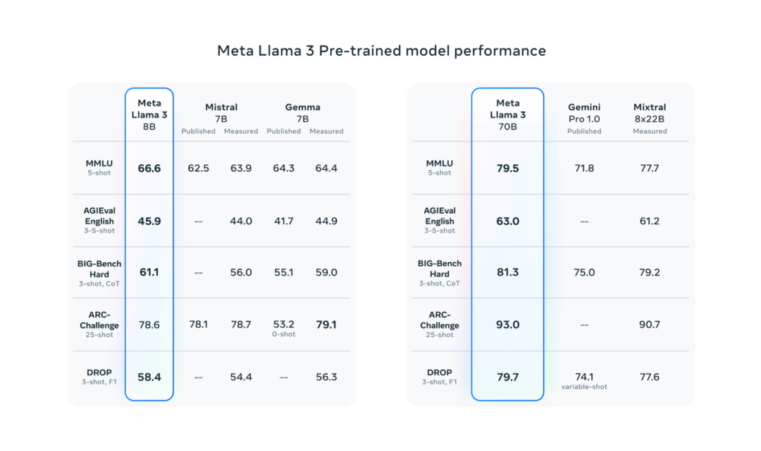 除了向量数据库以外,RAG 应用的另一个关键组件是 LLM。市面上有多种开源 LLM,其中 Llama 和 Mistral 是较为受欢迎的两种。在本文将使用 Meta 开发的 Llama3 模型作为我们的 LLM。Llama3 模型相比 Llama2 基于 7 倍更大的数据集进行预训练,极大提升了性能。