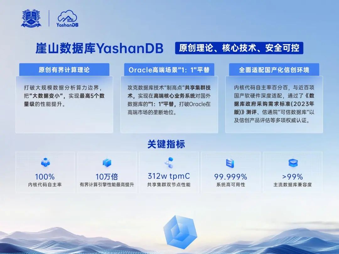 数据为基,彰显原创实力。作为国内率先实现关键技术突破的数据库系统之一,YashanDB内核代码自主率100%,在经典数据库理论基础上融入了系列原创理论——有界计算、近似计算、异步并行执行、跨模计算等,提供单机/主备、共享集群、分布式等系列数据库产品,领跑数据库核心技术,助力解决关键领域“卡脖子”难题。
