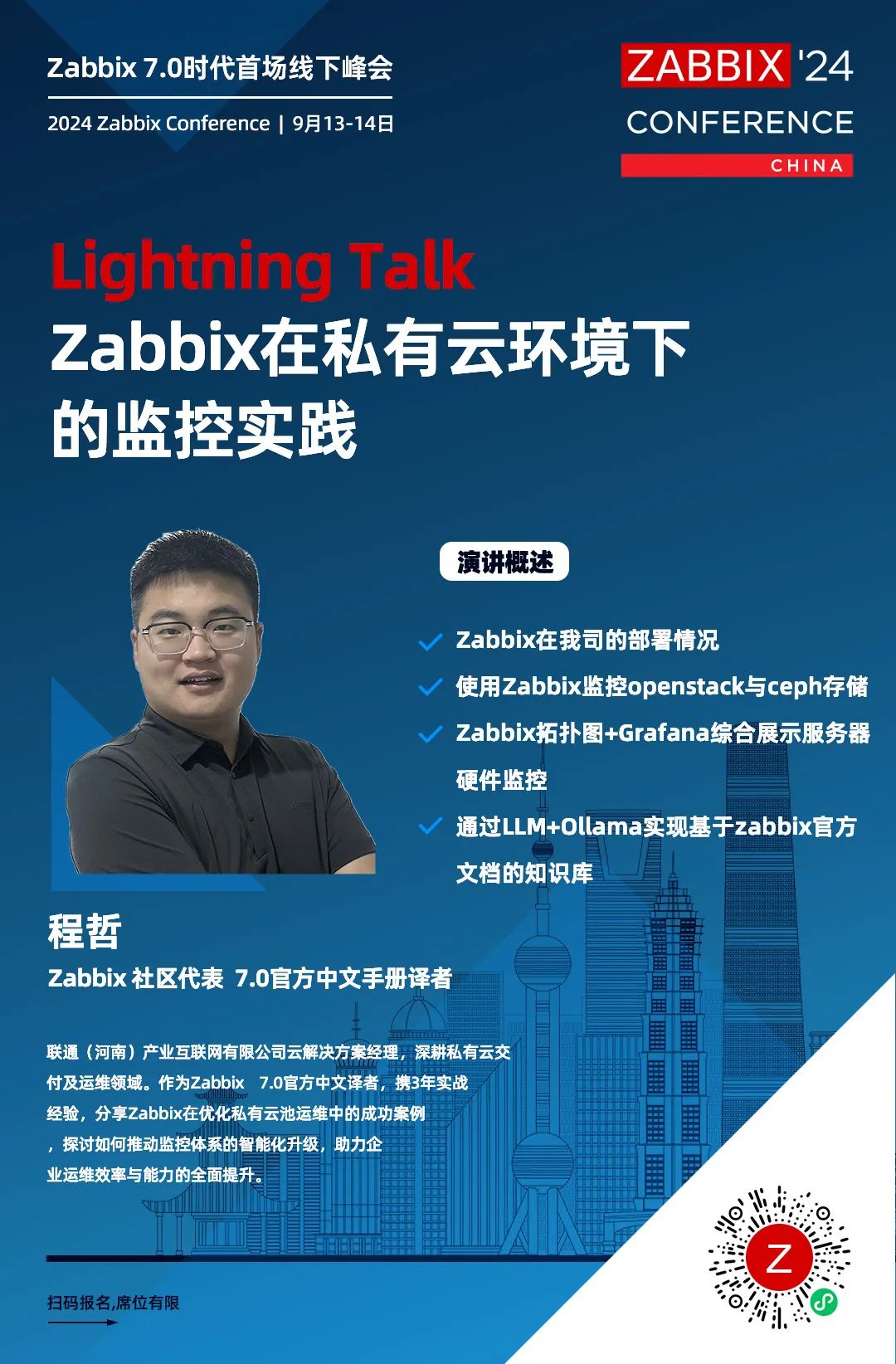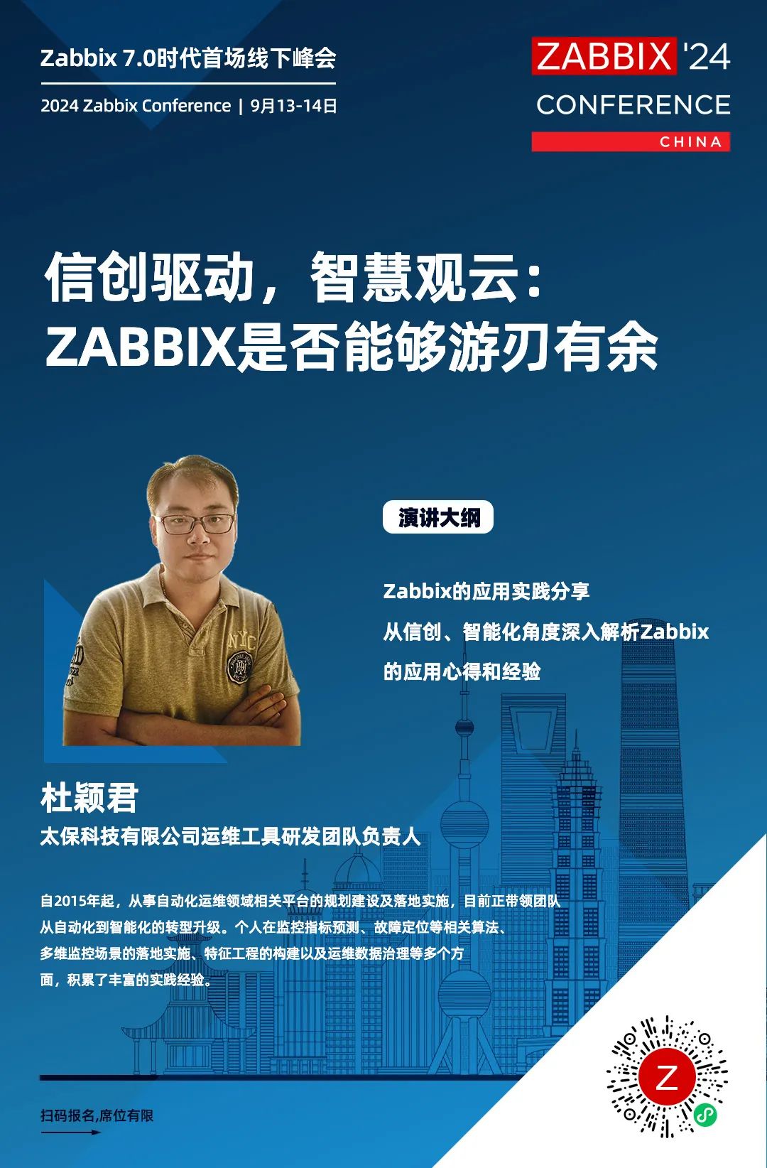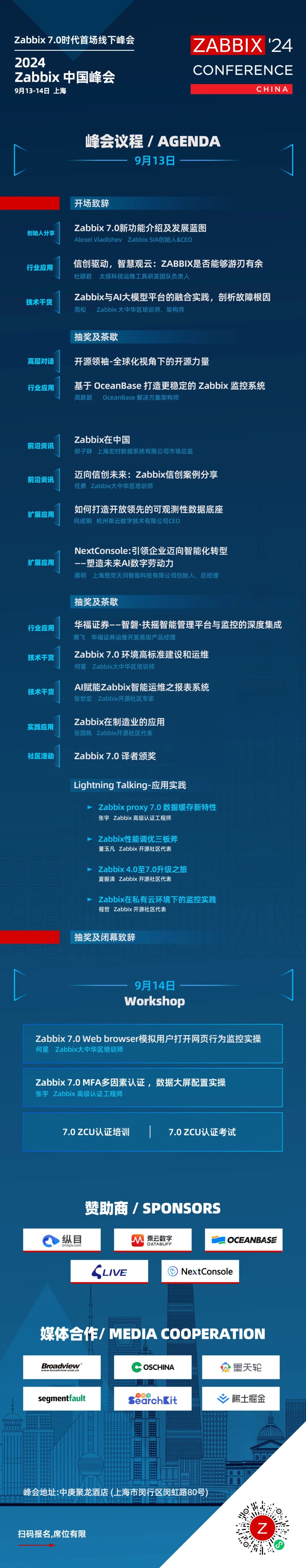 Zabbix开源社区链接用户,营造学习互助的社区氛围,为用户们及时传递Zabbix最新功能、资讯动态等,搭建学习、交流的平台,助力Zabbixer的不断成长! Zabbix中国峰会将于9月13日-14日在上海举办,加入我们,共赴这场Zabbix的年度盛会!在这里,您将有机会与行业领袖、技术专家以及社区精英面对面交流,共同探讨监控技术的前沿趋势和实践应用。