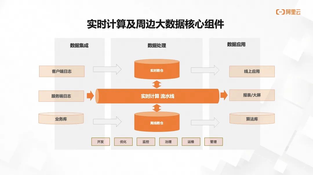 上图展示了一张实时计算及周边大数据核心组件的通用架构图。从左到右,分别是数据集成、数据处理和数据应用。在很多企业中,日志类数据和业务类数据通过集成工具导入到实时流水线或不同的数据仓库中进行计算和加工。生成的数据再应用于线上业务或算法库。中间过程涉及开发、优化、监控、治理、运维和管理等环节。因此,在这样的技术架构下,企业在进行升级时会产生许多需求。下面我将介绍阿里云提供的大数据产品和产品组合是如何支撑这些需求的。