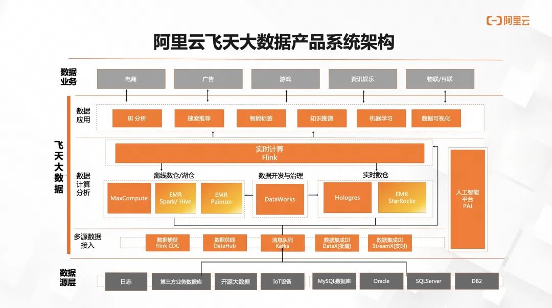 上图展示了阿里云飞天大数据体系的产品大图。我们从下往上看,不同业务的公司有不同类型的数据源,比如业务日志数据、数据库数据及 binlog 数据、开源大数据存储的数据、IoT 设备等各种类型的业务数据库。这些数据通过集成工具接入到数据计算和分析层。计算和分析层的实时计算流水线会加速企业的数据处理。