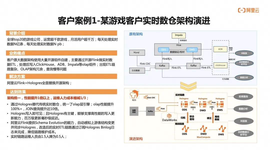 该客户是全球 Top 20 的游戏公司,运营很多游戏,每天处理的实时数据达到 pb 级。原有技术架构的痛点是 OLAP 组件很多,每个 OLAP 都有自己的特点,例如 Clickhouse 擅长大宽表、ADB 擅长较小规模数据量分析等,离线数据的查询基于传统的 Impala 方式等。整个架构流程是:数据库及日志数据进入 Kafka,Flink 消费 Kafka 中 topic 数据进行逐层的加工和分析。同时过程中 Flink 还会把数据写入离线链路,离线引擎做数据的校验和备份等。如果过程中出现问题,可以使用 Impala 做离线数据加速查询,用以排查问题和校验分析。实时链路最后将数据写入 Clickhouse 中,而为了保证实时链路的稳定性,离线数据最后加工以及与实时数据的比对采用了另外一个 OLAP 引擎 ADB。